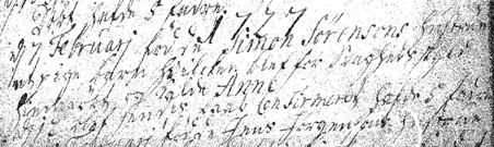 1727 D. 7 Februari fødde Simon Sørensens hustrue et pige barn hvilchen blef for svagheds skyld hjemdøbt og kaldet Anne. D 12 blef hindes daab confirmeret, hafde 5 fadre.