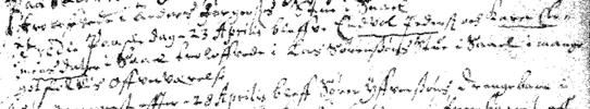 Tredie påskedag - 23 Aprilis bleffve Envol Pedersen och Karen Clem- insdatter i Saal troloffvede i Las Sørensøns Stue i Saael i mange gotfolkis offveværelsi.
